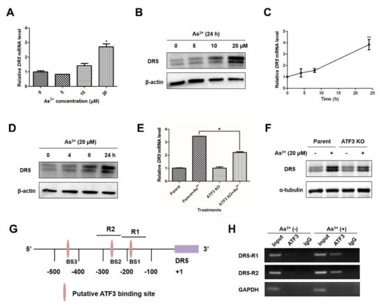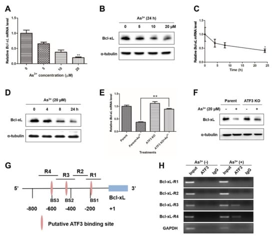 Chicago/Turabian StyleShi, Qiwen, Bei Hu, Chen Yang, Lan Zhao, Jing Wu, and Nan Qi. 2021. "ATF3 Promotes Arsenic-Induced Apoptosis and Oppositely Regulates DR5 and Bcl-xL Expression in Human Bronchial Epithelial Cells" International Journal of Molecular Sciences 22, no. 8: 4223. https://doi.org/10.3390/ijms22084223