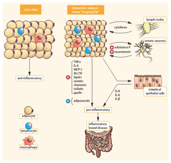 Mesenteric adipose tissue (MAT) is a biologically very active fat compartment [34,40,41]. MAT may influence the gut barrier function by promoting the innate immune response to the gut flora. MAT may be the principal source of cytokines responsible for inflammatory processes associated with IBDs, for example interleukins (IL): IL-1β, IL-4, IL-6, IL-8, IL-10, tumor necrosis factor-α (TNF-α), adipokines, and other mediators (e.g., angiotensinogen, plasminogen activator inhibitor-1) [40,41]. The degree of cytokine expression has been shown to correlate with adipocyte mass [42]. Furthermore, preadipocytes and adipocytes can express a broad spectrum of functional innate immune receptors, namely Toll-like receptors and nucleotide-binding oligomerization domain-containing proteins 1 and 2 as a reaction to bacterial stimuli [40,43].