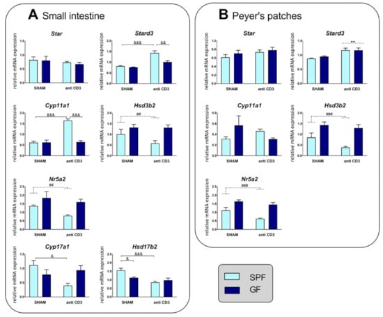 2.2. Effect of the Microbiota and Acute Immune Stress on the Expression of Genes Associated with Steroidogenesis in the Small Intestine and Peyer’s Patches