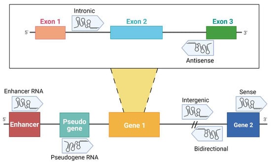 Classification of lncRNAs according to their genome localization. Intronic: the sequence originates from an intron region of a protein-coding gene []. Antisense: transcribed from the antisense strand of a gene sequence, originating from an exon or intron region []. Enhancer RNA (eRNA): RNA transcribed from transcriptional enhancer. eRNAs could present polyadenylation and 5′ cap. Generally, they are unstable with a short half-life [,,]. Pseudogene RNA: the transcripts originated from pseudogene and could be short or long ncRNAs [,]. Intergenic: the localization is in an intergenic region, precisely more than 1 kb away from closest genes [,,]. Bidirectional: the sequence is mainly located on the opposite strand with respect to a gene, of which transcription starts less than 1000 bp away [,,]. Sense: this kind of lncRNA is transcribed from the sense strand and contains exons of protein-coding genes []; some are variants of mRNAs, while others do not contain a functional open reading frame []. Created with BioRender.com (accessed on 9 April 2021).
