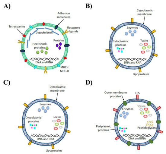 Recent studies have evidenced that the content in EVs differs between distinct bacterial species and even the same bacteria can produce different vesicles when external conditions change []. Bacterial vesicles contain diverse molecules such as proteins, lipids, nucleic acids and LPS. The identified bacterial EV molecules are listed in the EVpedia database (http://microvesicles.org/index.html, accessed on 19 April 2021) []. More than 100 vesicular proteins have been identified and most are associated with the extracellular region of Gram-negative bacteria such as the outer membrane, periplasm and inner membrane. The biological processes in which these proteins participate are the outer membrane assembly, pathogenesis, protein folding, protein insertion into the membrane and siderophore transport []. The virulence of bacterial EVs may differ between the bacteria of the same species. For instance, some Vibrio cholera strains, which, at a low cell density, produce OMVs with less peptidoglycan inside than at a high cell density, present a weaker and strong immunogenic effect, respectively []. These differences in composition may also bring about variations in the morphology of EVs [].
