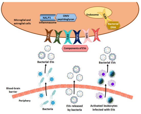Recent evidence has demonstrated the role of bacterial EVs from the gut during neurodevelopmental processes and brain dysfunctions by modulating the immune response. These vesicles are able to cross the BBB and interact with the immune receptors of the TLRs of glial cells, which leads to the production of cytokines and inflammatory mediators and alters the brain function (Figure 3). However, the degree of penetration of bacterial EVs into the brain tissue from either blood peripheral system circulation or the gastrointestinal tract remains an important question to answer to uncover the function of bacterial vesicles and their relationship with brain diseases.