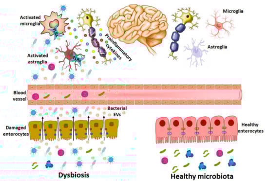 Bacterial EVs released during dysbiosis are able to cause brain disorders. In dysbiosis, the abundance of pathogenic bacterial species and harmful molecules such as LPS, peptidoglycans and toxins increase in the gastrointestinal tract and the intestinal epithelium is damaged by both bacterial activity and the inflammatory immune response, which increases the permeability and the transfer of EV components (e.g., LPS, RNA, DNA, proteins) from the intestinal lumen to the bloodstream. EVs might use paracellular and/or transcellular pathways to cross the intestinal barrier or be released by the bacteria already in blood vessels. If these vesicles reach the CNS, they activate immune cells (e.g., astrocytes and microglia) through the immune receptors of TLRs by triggering pro-inflammatory cytokines and causing neuronal damage.