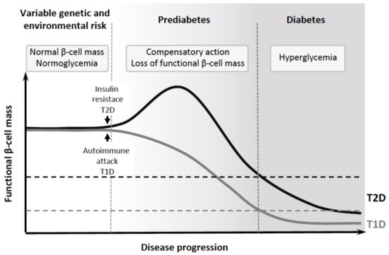 Diabetes, a metabolic disease characterized by chronic hyperglycemia due to insufficient production of insulin to meet the insulin demand, is nowadays the most prevalent chronic disease affecting approximately 463 million adults worldwide, and its incidence is expected to rise up to 700 million people by 2045 (IDF, www.idf.org (accessed on 18 April 2021)). Diabetes development results from both polygenic and environmental contributors that lead to a progressive decrease in the functional β-cell mass, either due to autoimmune destruction of β-cells in type 1 diabetes (T1D) or due to β-cell dysfunction/dedifferentiation in type 2 diabetes (T2D) and gestational diabetes (GD) [1]. In both T1D and T2D, the disease progresses through an asymptomatic phase before being detected, since only after a reduction of 65–80% of the β-cell mass is when hyperglycemia develops [2,3]. Thus, the pathogenesis of diabetes is a continuum that can be divided into different stages associated with changes in β-cell mass, phenotype, and function (Figure 1) [4,5]. Current treatments for diabetes are based on the administration of exogenous insulin or insulin analogs, or treatment with agents that stimulate insulin secretion by β-cells, improve insulin sensitivity, promote glucose excretion, or delay carbohydrate digestion. However, despite their beneficial effects, these therapies do not prevent the development of life-threatening complications. The definitive therapy for diabetes, independently of the disease etiology, will rely on the restoration of the β-cell mass and function, allowing the recovery of the endogenous control of glucose homeostasis. Therefore, understanding processes affecting the functionality of the β-cell mass, together with the characterization of islet adaptive mechanisms, will open new avenues for the identification of “druggable” targets that can protect/regenerate endogenous β-cell, rendering a better control of blood glucose levels.