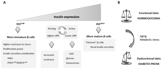 Heterogeneity of islet β-cells. (A) Differences in insulin and other β-cell marker genes give rise to the apparition of different β-cell subpopulations with different functionalities. (B) The maintenance of the proportions of these subpopulations ensures the adequate function of the islets. Aging and stress conditions can alter these subpopulations with detrimental consequences for islet functionality and adaptation that can eventually lead to the development of diabetes under stress conditions.