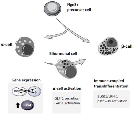 ⍺- to β-cell transdifferentiation. The common origin of ⍺- and β-cells resulted in permissive epigenetic marks in ⍺-cells that under specific circumstances can activate their transdifferentiation into β-cells. This reprogramming of ⍺-cells into β-cells that is activated in islets under stress conditions is not able to regenerate an adequate β-cell mass to recover the endogenous control of glycemia. However, this process that involves a close crosstalk between islet cells as well as with the immune system cells can be stimulated by different treatments, such as GLP-1 and likely GABA, as well as the novel small molecule BL001.