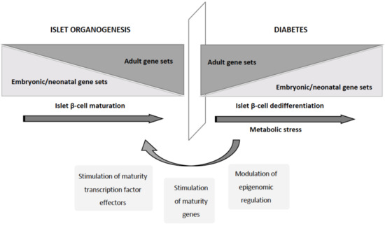 The islets of Langerhans are highly specialized endocrine micro-organs of the pancreas responsible for the control of body glucose levels. The islet is an amalgam of five different types of cells, glucagon-producing α-cells, insulin-producing β-cells, somatostatin-producing δ-cells, pancreatic polypeptide-producing PP-cells, and ghrelin-producing ε-cells, which are derived from a common NGN3+ endocrine progenitor (refer to [6] for a detailed review of islet organogenesis). At birth, pancreatic islets are still immature and defective in glucose-stimulated insulin secretion (GSIS) [7,8]. During early postnatal life, the pancreatic islets undergo a period of reorganization/proliferation and maturation to form fully functional islets, with multicellular interactions that ensure the correct blood glucose homeostasis. Different age-dependent gene expression programs are responsible for controlling the functional maturation of the islets. Juvenile-enriched gene sets are mainly associated with the unfolded protein response (UPR) and cell proliferation, while adult islets show an enrichment in genes associated with hormone production/secretion and cell signaling [9]. Remarkably, these changes in gene expression are associated with alterations in the histone modification profile. ChIP-seq analyses of the adult gene set associated with the physiological function of the islet, in both adult and juvenile islets, revealed that these genes are enriched in active H3k4me3 and H3K27ac marks in adult islets but also enriched in repressive H3K27me3 marks in juvenile islets, highlighting the importance of epigenetic regulation in the maturation of pancreatic islets [8,9]. After this maturation period, adult islets have been considered postmitotic, relatively quiescent organs, with limited capacity to adapt to environmental insults. However, this dogma has been challenged. Different studies have demonstrated that adult pancreatic islets possess an intrinsic plasticity, based, at least in part, on the heterogeneity detected in the insulin-producing β-cell population [10,11], that renders some of these subpopulations more resistant to environmental insults and prone to proliferation [12]. Likewise, under specific circumstances, islet non-β-cells can transdifferentiate into β-cells, contributing to the regeneration of the functional β-cell mass [13,14], and the regenerative capacity of the β-cells, which can be activated after the relief of the metabolic stress. Since diabetes is characterized by the inability of pancreatic β-cells to meet the insulin demand, due to either a nearly complete loss (T1D) or a deficit (T2D and GD) in functional β-cells, this intrinsic plasticity of adult islets opens the possibility of the development of novel regenerative therapies for the cure of this currently chronic disease.