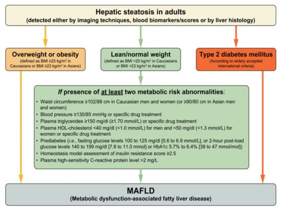 Metabolic dysfunction-associated fatty liver disease (MAFLD) has become the most common chronic liver condition in developed and developing countries due to the burgeoning in the incidence of obesity and metabolic syndrome(MetS) []. MAFLD was previously identified as non-alcoholic fatty liver disease defined as the accumulation of excess fat in hepatocytes, in the absence of secondary causes of steatosis such as excess alcohol intake (30 g/day for men and 20 g/day for women) [,]. The MAFLD spectrum ranges from simple steatosis to steatohepatitis and ultimately development of fibrosis and cirrhosis in the long term with an increased risk of hepatocellular carcinoma [,]. Importantly, as many as 30% of subjects with fatty liver disease have histologic evidence of liver inflammation, which in turn is associated with increased risk of progression to cirrhosis []. Recently, an international expert consensus statement coined the new definition of fatty liver disease associated with metabolic dysfunction, MAFLD [], to extend the perspective of disease assessment and severity stratification beyond a simple dichotomous classification of steatohepatitis vs. non-steatohepatitis. Moreover, this was based on the evidence of hepatic steatosis, in addition to one of the following three criteria: overweight/obesity, diabetes mellitus or evidence of metabolic dysregulation, as summarized in Figure 1 [].