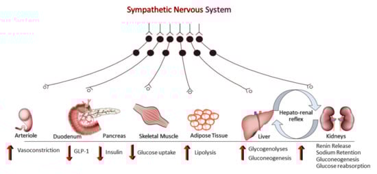In addition to from lifestyle interventions and pharmacotherapy, device-based approaches are used to achieve sympathetic inhibition not only in the management of hypertension and its cardiovascular complications but also in metabolic conditions associated with sympathetic overdrive such as type 2 diabetes and MetS []. Catheter-based renal and more recently hepatic denervation were proven to be safe and demonstrated significant improvements in the cardiometabolic profile in line with the pathophysiological considerations described earlier such as the hepato-renal reflex and the close interaction between the SNS and glucose metabolism [,]. Increased sympathetic tone in the vasculature of the skeletal muscle plays a significant role in glucose metabolism, mainly through reduction in blood flow to the skeletal musculature, thereby diminishing glucose uptake, a hallmark of insulin resistance []. Renal sympathetic denervation substantially reduced sympathetic activity [,,] and improved glucose metabolism along with BP lowering in patients with resistant hypertension []. Renal denervation performed in woman with polycystic ovary syndrome, commonly characterized by overweight/obesity, insulin resistance, sympathetic overdrive and BP elevation, improved insulin sensitivity by 17.5% in the absence of any weight changes at three months accompanied by regression of renal damage [,].