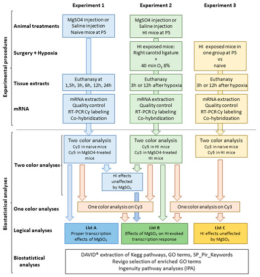 Transcriptome analyses were performed on the basis of three independent experiments. Experiment 1 compared the effects of single MgSO4 injection to phosphate buffered saline (PBS) injection, Experiment 2 compared the effects of MgSO4 or PBS injection prior to HI, and Experiment 3 compared the effects of HI compared to control mice (Figure 1). The comparison of the 3 experiments was performed using the combination of two-color and one-color analyses of hybridization data detailed in Section 4.3 (Figure 2).