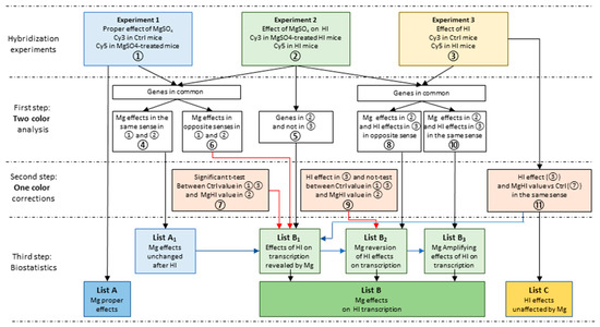 Detailed procedure of extraction of List A of proper effects of MgSO4 treatment, and List B collecting the different MgSO4 modulation of HI response to HI in P5 brain. All three experiments were analyzed independently (first step analyses in two-color co-hybridization experiments), providing lists of genes noted ①, ②, and ③. The genes detected in experiment 1 provided the List A of proper effects of MgSO4 single injection, to be submitted to pathway and gene ontology analyses. Coincident observations in ① and ② were extracted and split into two sub-series (④ and ⑥). List B constitutes the effects of MgSO4 seen only in the HI context (List B1), MgSO4 reversion of HI effects (List B2), and MgSO4 amplification of HI effects (List B3), combining two-color and one-color analyses. The subseries of List A (④)—containing genes showing induction after MgSO4 injection in both control (①) and HI-exposed (②) animals regrouping the genes affected by MgSO4 that were unchanged after HI—was subtracted from List B. List C contains genes affected by HI in control as well as in MgSO4-pretreated mice. Black and Red arrows indicate two-color and one color insertions; blue arrows indicate subtractions in destination boxes.