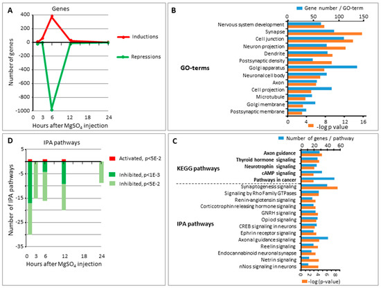 Effects of MgSO4 (600 mg/kg) single injection in P5 mouse brain transcription. (A) Time course response on inductions (in red) and repressions (in green, labeled as negative values) showing a very transient wave of inductions and repressions centered on 6 h after injection time point. (B) Time course distribution of significantly enriched IPA-Pathways extracted from MgSO4 single injection. (C) Gene numbers and log p-values in 13 Gene Ontology terms enriched from 1 h 30 min–24 h effects of MgSO4 single injection. (D) Gene numbers and log p-values in Kyoto Encyclopedia of Genes and Genomes (Kegg) and IPA Pathways significantly enriched from 1 h 30 min–24 h effects of MgSO4 single.