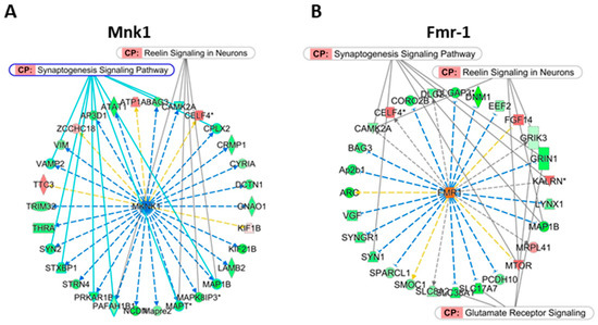 Schematic representation of two MgSO4 putative upstream regulators (pURs) 6 h after injection. Blue and orange background in pURs (centered) indicate inhibition and activation respectively. Red and green backgrounds in genes downstream to pURs indicate gene induction or repression. (A) Putative Mnk1 inhibition by MgSO4 based on 30 transcription effects recorded. (B) Putative Fmr-1 activation by MgSO4 based on 20 transcription effects recorded. Blue, yellow, and gray arrows indicate coherence, absence of coherence or undetermined sense of variation of respective genes in observations and in the literature, according to IPA® analysis. *; multiple identifiers (probes) in data list.