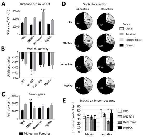 The activity estimated by the running distance in the free wheel showed a significant effect of sex (females were more active than males) in the two-way ANOVA. The Bonferroni post-test showed an increased activity in females treated by ketamine (Figure 5A). No differences between acutely treated neonates (BPS, MK-801, or MgSO4) nor in Repeat-edly treated animals (PBS or MgSO4) were observed. It is noteworthy that repeated injection, which required daily handling in pups, had a lasting reduction effect on activity, although the nature of the treatment had no effect (Figure S3A,B, Table S4).