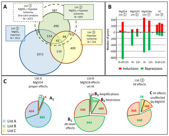 - List B3 (concatenation of ⑩−④) contains the genes affected by HI in the same sense after HI in Ctrl or in MgSO4 pretreated animals (⑩ in Figure 2) minus A1 (④).