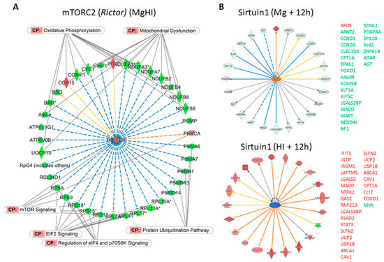 Putative upstream regulators in MgHI. (A) Activation of mTORC2 (coded by Rictor) as a pUR (p = 4.7 × 10−6, z = 4.885) as an effect of MgSO4 observed after HI in List B, and based on 34 gene repressions and 3 inductions. This series of gene contributed to several canonical pathways (CP) associated with Mtor signaling, mitochondrial dysfunction, oxidative phosphorylation, ubiquitination pathway, and protein translation by elongation factors Eif2 and Eif4. (B) Activation of sirtuin-1 (coded by Sirt1) at 12 h after MgSO4 injection (upper panel) or inhibition 12 h after HI (lower panel) and resulting in the opposite gene repressions (in green on lists on the right) or inductions (in red on lists on the right). *; multiple identifiers (probes) in data list.