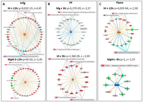 Several apparent discordances appeared between MgHI vs. HI effects and MgHI vs. Ctrl effects, likely due to the different timing of evaluation, and the occurrence of transient responses (Figure 7). Indeed, the rapid bio-availability of Mg2+ and its rapid clearance may have short-term effects that do not last or are overwhelmed by HI effects. Thus, comparing pURs in the nine lists, we could classify the observations in four groups. Only one gene/protein (Rictor) appeared as a de novo pUR in MgHI. Three pURs exhibited opposite z-scores in the Mg and HI groups, resulting in annihilation or HI reversion effects in MgHI (Casr, Ppara and Fmr1). In addition, larger series with less clear patterns regrouped pUR in HI for which MgSO4 prevented (n = 68) or did not affect (n = 48) their significance in MgHI (Table S2E). These series contain many genes involved in effectors in inflammation, cell death, transcription, and DNA repair, indicating that MgSO4 in fact reduced these effects, although the analysis pointed out few specific putative Mg targets for these effects. Five entities, however, retained our attention—Rictor, Infg, Il4, Ppara, and Sirt1.