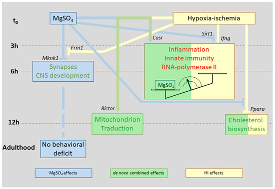 It is likely that prenatal Mg2+ supplementation exerts neuroprotection via systemic and central effects. It has been suggested that direct effects at the fetal brain level occur through calcium antagonism and/or glutamate N-methyl-D-aspartate type glutamate receptor (NMDA) blockade [23]. Inflammation in the mother or consecutive hypoxia–ischemia is a major trigger of neonatal brain lesions and magnesium exerts anti-inflammatory activity in human or animal neonates [24,25]. MgSO4 pretreatment provided neuroprotection in the Rice and Vannucci experimental paradigm modeling hypoxia-ischemia (HI), and in the excitotoxic model of ibotenic acid injection [26,27]. In these models, the effects of MgSO4 do not account for maternal-mediated effects, suggesting direct effects in the neonate brain and improved delayed behavior [18,28]. In the 5 day-old mouse brain, HI provoked an early onset of coordinated gene inductions (repressions) 3 h to 12 h after insult, affecting transcription regulation at the RNA-polymerase-II complex, inflammation, cell death, and angiogenesis. In parallel, convergent gene repression affected many genes encoding for cholesterol metabolism enzymes and synaptic actors [29]. The causal factors of long-term deleterious consequences among these regulations are likely to be explored in the field of inflammation as well as its interaction with development [30,31,32].