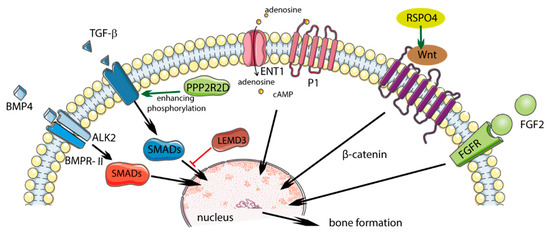 Many proteins and signaling pathways are responsible for bone formation and healing, including the Wnt/β-catenin signaling pathway. Wnt ligands bind to the receptor complex (frizzled and low-density lipoprotein receptor-related protein (LRP5 or LPR6)), causing the release of β-catenin by phosphorylation, which releases it from the multiprotein complex. The accumulation of β-catenin in the cytoplasm and ultimately its translocation to the nucleus result in the activation of target genes [8]. TGF-β is another signaling pathway involved in the differentiation of bone-forming osteoblasts, skeletal genesis, and bone homeostasis. In humans, heterozygous pathogenic changes in fibrillin 1 (FBN1), transforming growth factor beta receptor 1/2 (TGFBR1/2), or in TGF-β inhibit this signaling pathway, phenotypically causing skeletal-deformity diseases (Marfan, Loeys Dietz, and Camurati–Engelman syndrome) [9]. Many cytokines, growth factors, hormones, and vitamins are involved in the bone-repair and -remodeling phases. Growth factors belonging to the TGF-β superfamily, bone morphogenetic proteins (BMP), or TGF-β1 act locally on bone formation by stimulating the proliferation and osteogenic differentiation of mesenchymal stem cells (MSC) [9].
