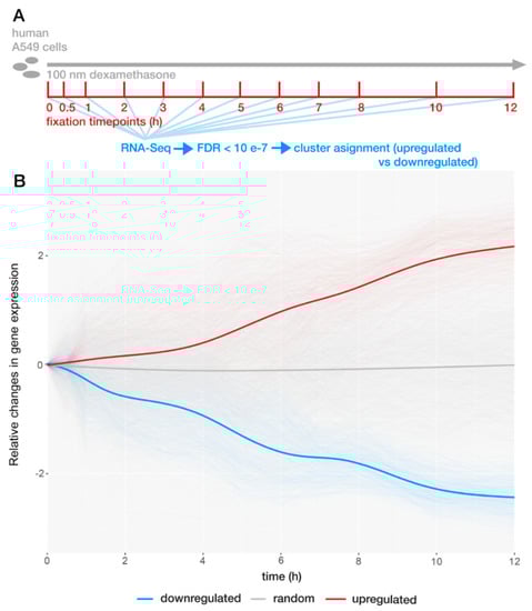 Profile of glucocorticoid receptor (GR)-induced gene expression changes. (A) Schematic representation of the experiment that was performed to generate the data analyzed in this publication. Data were downloaded from the ENCODE project database [,]. A549 epithelial-like human cell line was treated with 100 nM dexamethasone, and cells were fixed at distinct time points between 30 min and 12 h. RNA-Seq was performed at each time point. Raw RNA-Seq data were normalized and filtered for false discovery rate (FDR) < 0.0000001. (B) Abundance levels of transcript for each gene were scaled with z-score transformation and leveled to 0 at 0 min time point. Blue cluster—downregulated genes, red cluster—upregulated genes, gray cluster—not regulated genes. Table S1 contains a full list of regulated genes together with the p-value, FDR and cluster information. Table S2 lists the same information for selected random genes. Full raw data from the experiments are available from both ENCODE and GEO databases (see Materials and Methods).
