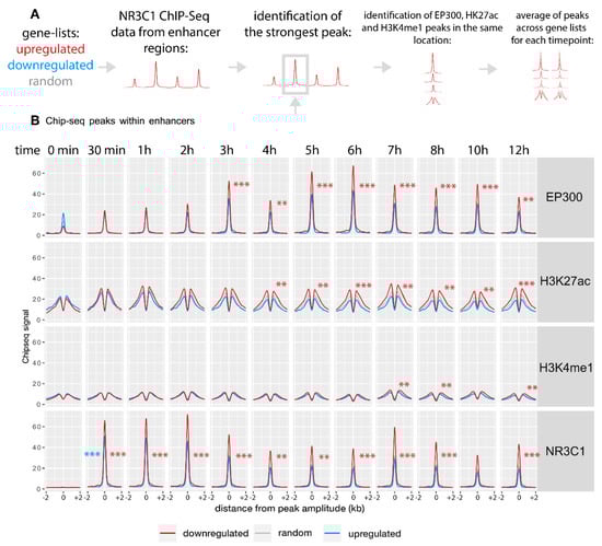 Time-course of average shapes of enhancer peaks associated with NR3C1. (A) Schematic representation of data analysis process. For each of the selected genes, the enhancer region was scanned for the strongest NR3C1 peak (+/− 100 kb with the exclusion of +/− 2 kb). EP300, H3K27ac, and H3K4me1 peaks were extracted from the same locations and averaged across genes from each cluster. (B) Each peak was centered according to the amplitude of NR3C1, and +/− 2 kb surrounding this position are plotted for each time point (average signal across genes). Two-way ANOVA time x regulation cluster: EP300: F = 22.6, p = 2 × 10−6; H3K27ac: F = 17.35, p = 3.2 × 10−5; H3K4me1: F = 14.96, p = 1.1 × 10−4; NR3C1: F = 6.43, p = 0.011 (also see Figures S5 and S6, Statistics: Tables S3, S4 and S5). Stars represent the p-values of post hoc t-tests that compared amplitudes of peaks divided by the amplitude of random peaks in each cluster (upregulated: red stars, downregulated: blue stars) at each time point compared to the same value at 0 min. ** p < 0.01, *** p < 0.001.