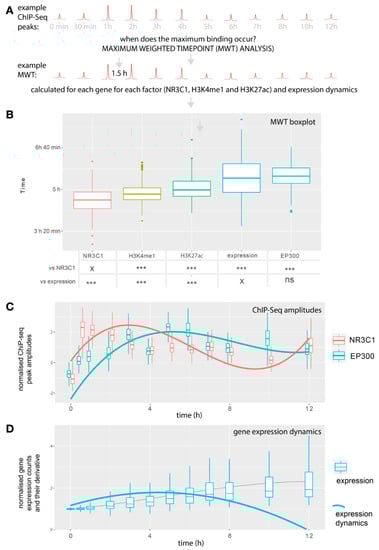 We interrogated the timing of gene expression dynamics concerning enhancer remodeling for upregulated genes. For gene expression, the time point of the largest dynamics was calculated as a weighted time average, where the first derivative of normalized transcript abundance was used as weights. For each of the analyzed ChIP-Seq tracks, maximum binding was interrogated by calculating a weighted time point with amplitudes at each time used as weights. The median weighted time point of maximum gene expression changes was 5 h and 27 min. Although increased and decreased gene expression is visible after 30 min of dexamethasone treatment, the changes do not reach their maximum dynamics for hours. The median weighted time point of maximum NR3C1 binding was 4 h 36 min. For H3K27ac and H3K4me1, the time points were 4 h 59 min and 4 h 48 min, respectively. Thus, gene expression changes reach maximum dynamics 51 min after maximum NR3C1 recruitment, and H3K27ac and H3K4me1 maximum amplitudes are observed within this interval. Most strikingly, the median of maximum EP300 binding nearly coincided in time with maximum changes in gene expression and occurred at 5 h 33 min. Thus, maximum expression dynamics occur together with the highest EP300 recruitment to peaks occupied by NR3C1 and are preceded with the highest NR3C1 binding and histone modifications (Figure 3).