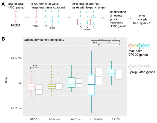 Analysis of gene expression dynamics and enhancer remodeling in upregulated genes with the highest changes in EP300 binding to enhancer sites. (A) Overview of the analysis steps. First, NR3C1 peaks were located. Next, EP300 peak amplitudes were collected. A list of 100 genes closest to the peaks with maximum EP300 changes was identified, and the upregulated genes from this list (n = 85) were subjected to MWT analysis (see Figure 3A). (B) Boxplots of MWTs for genes with largest EP300-binding changes (colored bars) compared with the data for upregulated genes (gray bars, same data as Figure 3B, gray bars). To compare weighted time points, two-way ANOVA with post hoc pairwise tests was used (See Table S9 and S9 for details). ** p < 0.01, *** p < 0.001 (p < 0.05 is not marked for clarity).