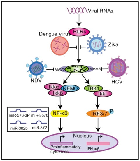 - Meylan, E.; Curran, J.; Hofmann, K.; Moradpour, D.; Binder, M.; Bartenschlager, R.; Tschopp, J. Cardif is an adaptor protein in the RIG-I antiviral pathway and is targeted by hepatitis C virus. Nature 2005, 437, 1167–1172. [Google Scholar] [CrossRef] [PubMed]