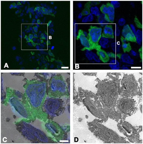 The specific ROIs in electron microscopy were localized and matched with the confocal images using DIC and DAPI channel images. Distinct morphological features, such as the contour of the tissue, vascular lumens, folded areas, and/or the distribution pattern of the cell nuclei, were used (Figure 1E,F). Using Photoshop (Adobe, San Jose, CA, USA), LM and EM images were overlapped in different layers, and the size and orientation of the images were adjusted to fit each other. The opacity of the overlapping layer was adjusted to show the correlation between the LM and EM images.