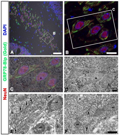 Correlated fluorescent signal and TEM image in the rat hippocampus. (A,B) Double-labeling of GRP78 and NeuN on confocal microscope images showing prominent GRP78-Bip signals in the vicinity of NeuN (+) neuronal nuclei. (C) Confocal microscopic image overlaid onto the corresponding electron microscopic image. (D) The corresponding transmission electron microscopic images obtained from the same field. (E,F) Higher magnification of the boxed area showing the gold particles in the rough endoplasmic reticulum (rER) membranes (arrows) coinciding with the green signals of GRP78-Bip in (A,C). mt, mitochondria. Scale bar = 50 µm for (A); Scale bar = 10 µm for (B); Scale bar = 4 µm for (C,D); Scale bar = 0.4 µm for (E,F).