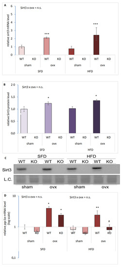 Since ovaries are the main source of female sex hormones’ production in the body [15], we performed ovariectomy (ovx) to assess the effect of ovary hormones in our experiments. Loss of ovarian hormones was confirmed by reduced uterus size and by cytological examination of vaginal smears, showing estrous phase in control (sham) and anestrous phase in ovx mice (Supplemental Figure S1A–C). To assess the functional role of hepatic Sirt3 with respect to ovx and HFD, we examined gene and protein expression in female sham and ovx Sirt3 WT and KO mice after 10 weeks of feeding with SFD or HFD. Ovx increased sirt3 gene (*** p < 0.001) and protein (* p < 0.05) expression in both SFD and HFD conditions (Figure 1A–C). Thus, ovx upregulated Sirt3 irrespective of type of diet in WT female mice. A similar pattern was observed with peroxisome proliferator-activated receptor-gamma coactivator-1 alpha (pgc1-α), a master regulator of mitochondrial function [16]. Ovx upregulated pgc1-α gene expression regardless of Sirt3 in SFD conditions (* p < 0.05) (Figure 1D). Following HFD, KO normalized ovx-induced (** p < 0.01) pgc1-α gene expression (a p < 0.01). These data indicate that ovx induces both pgc1-α and Sirt3 in WT mice irrespective of diet and that expression of the pgc1-α in ovx KO mice depends on the type of diet.