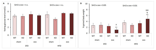 Fasting glucose level remained unchanged by either ovx or Sirt3 depletion in both SFD and HFD-fed mice (Figure 2A). In agreement with our previous observations [13], we found no change in body weight in SFD- and HFD-fed sham mice (data not shown). However, body weight gain was affected differently in ovx KO mice, depending on type of diet: SFD-fed KO ovx mice gained less weight than WT ovx (a p < 0.05) or sham KO mice (** p < 0.01) (Figure 2B). Contrary to SFD conditions, upon HFD, KO ovx mice gained more weight than WT ovx (b p < 0.01) or sham KO mice (** p < 0.01). Also, HFD-fed ovx KO mice were the only group that had increased body weight gain compared to their SFD littermates (xxx p < 0.001). These data indicate that ovary hormone deficiency in the absence of Sirt3 makes these mice most resistant towards gaining weight on SFD but also most sensitive towards gaining weight upon HFD.