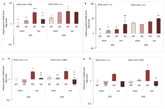 Sirt3 and ovx have a combined effect on the expression of genes involved in lipid metabolism and oxidative stress. Graphical displays of gene expression levels in sham and ovx Sirt3 WT and KO mice after 10 weeks of feeding with SFD or HFD. (A) pparα. SFD: ovx WT vs. KO (a p < 0.01); WT sham vs. ovx (*** p < 0.001). HFD: WT sham vs. ovx (* p < 0.05). SFD vs. HFD: sham (x p < 0.05), ovx KO (x p < 0.05). (B) cyp4a14. SFD: ovx WT vs. KO (a p < 0.05). HFD: KO sham vs. ovx (** p < 0.01). SFD vs. HFD: sham WT (xx p < 0.01); sham KO, ovx WT (x p < 0.05); ovx KO (xx p < 0.01). (C) cyp2e1. SFD: ovx WT vs. KO (a p < 0.01); WT sham vs. ovx (* p < 0.05); KO sham vs. ovx (** p < 0.01). HFD: ovx WT vs. KO (b p < 0.01); KO sham vs. ovx (** p < 0.01). SFD vs. HFD: sham KO (xx p < 0.01); ovx KO (x p < 0.05). (D) ho-1. SFD: no changes. HFD: WT sham vs. ovx (* p < 0.05); ovx WT vs. KO (a p < 0.05). SFD vs. HFD: no changes. β-actin was used for normalization. Data are shown as mean ± SD. n = 3 mice per group in technical triplicates.