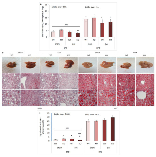 To determine whether the increase in expression of genes involved in lipid metabolism was associated with hepatic lipid accumulation with respect to Sirt3 and ovx in SFD and HFD conditions, we measured lipid content using Folch extraction and performed the immunohistochemical (IHC) analysis of hepatic tissue using oil red staining. In SFD conditions, ovx reduced lipid content in Sirt3-depleted mice (** p < 0.01) (Figure 4A). Expectedly, HFD-fed mice had more lipid content than SFD-fed (xxx p < 0.001), while ovx decreased lipid content in HFD conditions, irrespective of Sirt3 (* p < 0.05). IHC analysis showed interaction between Sirt3 and ovx in SFD-fed conditions: sham KO mice accumulated more lipids than WT (a p < 0.01), and ovx WT mice accumulated more lipids than sham (* p < 0.05). Similar to Folch, oil red staining showed that SFD-fed mice depleted of both Sirt3 and ovary hormones accumulated less lipids compared to either ovx WT (b p < 0.001) or sham KO mice (*** p < 0.001) (Figure 4B,C). In HFD conditions, all groups had higher lipid accumulation compared to their SFD-fed littermates (xxx p < 0.001).