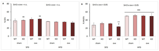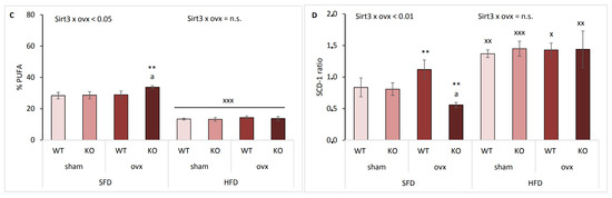 Stearoyl-CoA desaturase-1 (Scd-1) plays the important role in lipogenesis and is expressed in metabolically active tissues, such as liver and adipose tissue [21]. Desaturation index (DI), the ratio of product to precursor FAs, is an indirect marker for tissue Scd-1 activity, which is decreased in conditions of inhibited Scd-1 activity [4]. In our study, DI was determined for palmitoleic/palmitic acid. In SFD conditions, Sirt3 depletion significantly attenuated (a p < 0.001) ovx-mediated increase in Scd-1 ratio (** p < 0.01) (Figure 5D). HFD-fed mice displayed a similar Scd-1 ratio across all groups, which was significantly higher than SFD-fed groups (x p < 0.05, xx p < 0.01, xxx p < 0.001). Higher Scd-1 ratio in HFD-fed mice that indicates higher Scd-1 activity may be due to higher MUFA content in HFD rather than direct product of Scd-1 activity.