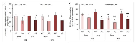 To determine if mitochondrial function was affected by ovx and/or Sirt3 depletion, we measured CI-driven (malate + glutamate, ADP added) and CII-driven (succinate + rotenone, ADP added) active mitochondrial respiration by Clark-type electrode. In SFD conditions, KO mice exhibited lower CI-driven respiration than WT mice irrespective of ovx (a p < 0.01) (Figure 7A). A similar effect was observed in HFD-fed mice (b p < 0.001), indicating the importance of Sirt3 in active mitochondrial respiration. CII-driven respiration showed a similar trend as CI considering Sirt3 in SFD conditions, with KO mice having lower respiration than WT mice in both sham (a p < 0.05) and to a greater extent in ovx group (b p < 0.001) (Figure 7B). Following HFD, KO mice also showed lower CII-driven respiration than WT mice (c p < 0.001). HFD generally decreased CII-driven respiration in both sham WT (xx p < 0.01) and KO mice (xxx p < 0.001) compared to their SFD-fed littermates. Surprisingly, CII-driven respiration was maintained in HFD-fed ovx mice, being higher than in HFD-fed sham mice (*** p < 0.001). These data indicate that mitochondrial CI-driven respiration depends only on Sirt3. Mitochondrial CII-driven respiration is also dependent on Sirt3, but is also diet and ovary hormone-dependent, with nutritional stress repressing CII- driven respiration only in sham mice.