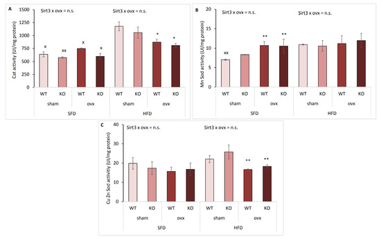 Since we previously found that the antioxidative enzyme system was affected in a sex-related manner with respect to the type of diet [13], we analyzed the activities of major antioxidant enzymes: catalase (Cat), manganese superoxide dismutase (MnSod), and copper-zinc superoxide dismutase (CuZnSod). Expectedly, Cat activity was unchanged within SFD-fed mice (Figure 8A). Within HFD, ovx mice had lower Cat activity than sham mice irrespective of Sirt3 (* p < 0.05), but it was still significantly increased compared to SFD-fed groups, indicating increased activity of Cat following HFD in all groups (x p < 0.05, xx p < 0.01). Interestingly, in the case of MnSod activity, hormone depletion increased it in SFD conditions (** p < 0.01) regardless of Sirt3 (Figure 8B). HFD-fed mice had no change in MnSod activity between groups, and only WT sham mice had increased activity compared to their SFD-fed littermates (xx p < 0.01). Similar to Cat activity, CuZnSod activity remained unchanged within SFD-fed mice, but also decreased in ovx mice compared to sham mice (** p < 0.01) following HFD (Figure 8C). This indicates that hormone depletion decreases both Cat and CuZnSod activity in HFD-fed mice. Overall, the activities of antioxidant enzymes were not affected by Sirt3, only by ovx and type of diet.