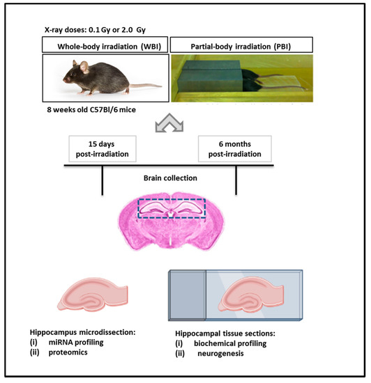 Very little is known about the impact of abscopal effects on a shielded brain upon the irradiation of distal organs. While our pioneering work highlighted the importance of communication between irradiated and non-irradiated tissues/organs in cancer induction in vivo [7,8], the potential contribution of out-of-target radiation effects in non-cancer pathologies is still scarcely investigated. Radiation-induced damage to the hippocampus, is known as a major determinant in cognitive dysfunction [4,27,28,29,30]. Here we have employed a multi-omic approach to provide a greater and comprehensive understanding of the sequence of events leading to radiation injury in the hippocampus, dissecting targeted and non-targeted radiation responses. To this aim, to integrate the information from multiple layers of biological data, we carried out miRNome, proteomics and biochemical profiling and analysis of adult hippocampal neurogenesis function.