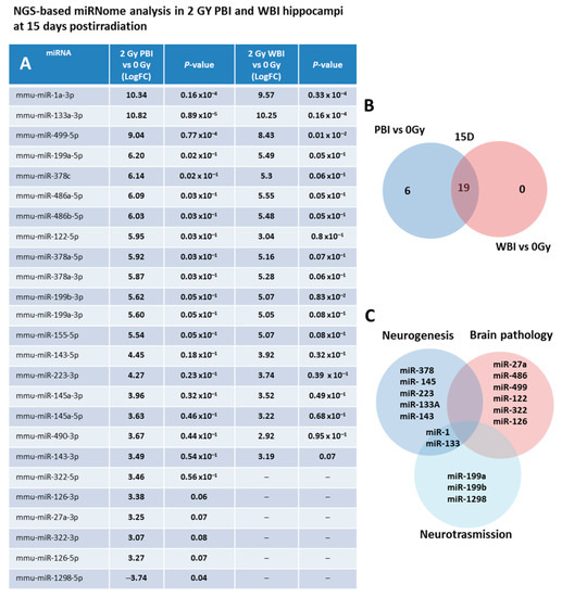 NGS-based miRNAs analysis in 2.0 Gy PBI and WBI hippocampi compared to SI mice at 15 days post-irradiation. (A) A p-value < 0.1 and a FC > 3 was defined as upregulation; p-value < 0.1 and a FC of <3 as downregulation. Samples not meeting the differential expression criteria are in gray. (B) Venn diagram of the significantly deregulated and shared genes in the hippocampus of PBI and WBI mice vs. SI mice. (C) Analysis of miRNA function. Data shown is from n = 3 mice for the SI control, 2 Gy PBI and 2 Gy WBI groups.