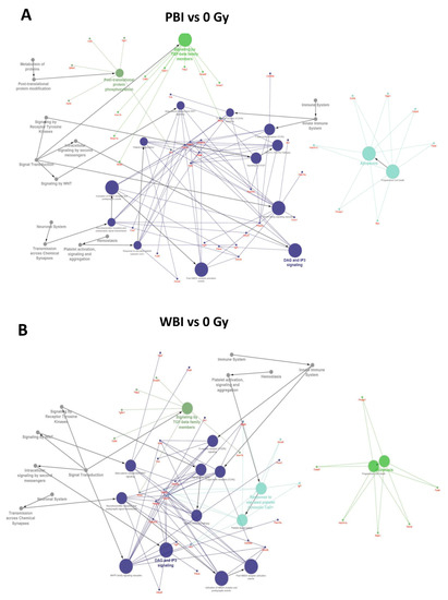 In this case, 15 days after irradiation, PBI, WBI and SI hippocampi were collected and total RNA was extracted using miRNeasy kit (≠217,004; QIAGEN, Milan, Italy) according to the manufacturer’s instructions. Total RNA (1 μg) was converted into miRNA NGS libraries using NEBNEXT library generation kit (New England Biolabs Inc., Beverly, MA, USA) following manufacturer’s instructions. Samples were sequenced on the Illumina NextSeq 500 System. All sequencing data analysis was performed using the R platform (http://www.r-project.org (accessed on 28 November 2018)) and the open-source Bioconductor libraries. Data were filtered based on sequence counts (i.e., >1 reads per million in at least 2 samples) and pairwise comparisons of differential miRNA expression were performed using edgeR package [54,55,56]. MiRNAs with a p-value < 0.1 were used for gene/miRNA enrichment analysis with Cytoscape plug-in “ClueGo” (v.2.1.7) and “CluePedia” (v.1.1.7) [57]. For each miRNA list, enrichment was performed for individual miRNAs employing the miRanda database (miRanda score threshold = 0.6) and showing the top 20 predicted target genes corresponding to each miRNA. Subsequently, predicted target genes and miRNAs were selected to find the affected functions on the Reactome database [58,59].