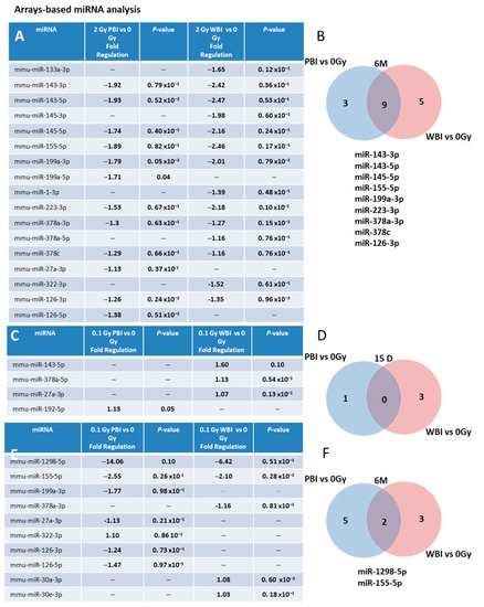 Time- and dose-dependence in radiation-induced modulation of hippocampal miRNAs. (A) Hippocampal miRNAs still deregulated 6 months after irradiation with 2 Gy PBI and WBI in custom PCR panels containing the 25 PCR primer sets of the miRNAs found deregulated at 15 days after irradiation with 2.0 Gy PBI. (B) Venn diagram of the significantly deregulated and shared genes in the hippocampus of 2.0 Gy PBI and WBI mice vs. SI mice at 6 months post-irradiation. (C) Hippocampal miRNAs deregulated 15 days after PBI and WBI exposure with 0.1 Gy in custom PCR panels explained in (A). (D) Venn diagram of the significantly deregulated and shared genes in the hippocampus of 0.1 Gy PBI and WBI mice vs. SI mice at 15 days post-irradiation. (E) Hippocampal miRNAs still deregulated 6 months after exposure at 0.1 Gy PBI and WBI in custom PCR panels explained in (A). (F) Venn diagram of the significantly deregulated and shared genes in the hippocampus of PBI and WBI mice vs. SI mice at 6 months post-irradiation. Data shown is from n = 3 mice for SI control, 2 Gy PBI and 2 Gy WBI at 6 months post-irradiation; SI control, 0.1 Gy PBI, 0.1 Gy WBI at 15 days post-irradition; 0.1 Gy PBI and 0.1 Gy WBI at 6 months post-irradiation.