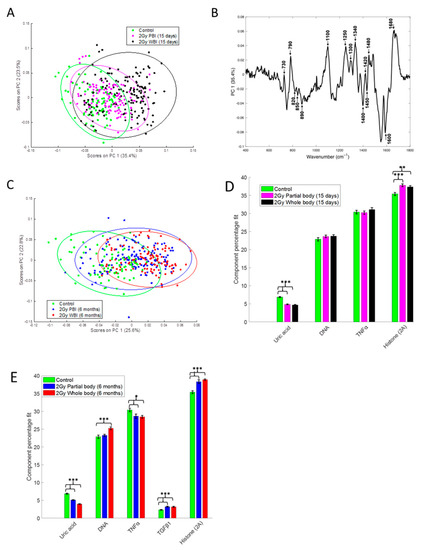 In addition, CLS fitting analysis was performed to estimate the relative fraction of reference spectra of pure components within the tissue spectra. From the components investigated, DNA, histone 2A, TNFα and uric acid were found to provide the best fit to the tissue spectra at 15 days post-irradiation (Figure 5D) with TGFβ also included for the tissue spectra at 6 months post-irradiation (Figure 5E). Interestingly, histone 2A was found to be significantly increased and uric acid was found to be significantly decreased in the 2.0 Gy PBI and 2.0 Gy WBI groups compared to the SI group at both 15 days and 6 months post-irradiation. In addition, at 6 months post-irradiation, TNFα was found to be significantly decreased and TGFβ was found to be significantly increased in the 2.0 Gy PBI and 2.0 Gy WBI groups compared to the SI group and DNA was found to be significantly increased in the 2.0 Gy WBI group compared to the SI group.