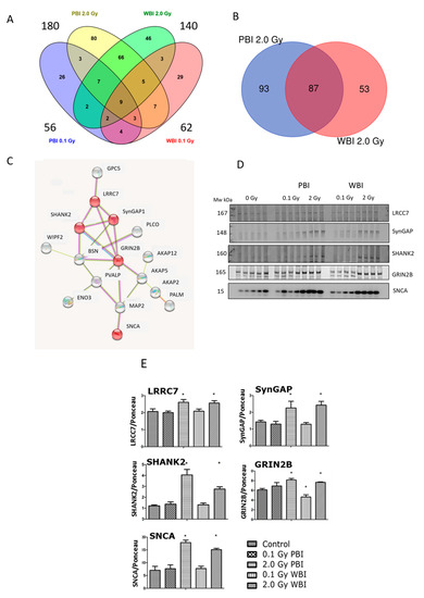 Radiation response of the hippocampal proteome at 15 days post-exposure using 0.1 Gy PBI, 0.1 Gy WBI, 2.0 Gy PBI or 2.0 Gy WBI. (A) Venn diagram demonstrating the total numbers of all deregulated proteins in each treatment group, of shared deregulated proteins between the four groups and of proteins exclusively deregulated in each condition (q ≤ 0.05, FC ± 1.3; identification with at least 2 UP, n = 4). (B) Venn diagram demonstrating the numbers of commonly deregulated and not commonly deregulated proteins in the 2.0 Gy PBI and 2.0 Gy WBI groups. (C) Protein–protein interaction analysis using the STRINGdb software tool (http://string-db.org, accessed on 20 April 2021) elucidating a tightly connected cluster consisting of 16 proteins within the commonly deregulated proteins between 2.0 Gy PBI and 2.0 Gy WBI groups. The proteins validated by immunoblotting are indicated in red. The gene names corresponding to the STRINGdb protein symbols are explained in Table 1. (D) Immunoblot verification of hippocampal protein changes in different treatment groups. (E) The quantification of the immunoblotting results with bar charts representing the average ratios of relative protein expression in control and irradiated samples after background correction to Ponceau. The error bars represent standard error of the mean (+SEM) (t-test; * p < 0.05; n = 4). Data shown is from n = 4 mice for all experiments in the SI control, 2 Gy PBI, 2 Gy WBI, 0.1 Gy PBI and 0.1 Gy WBI groups.
