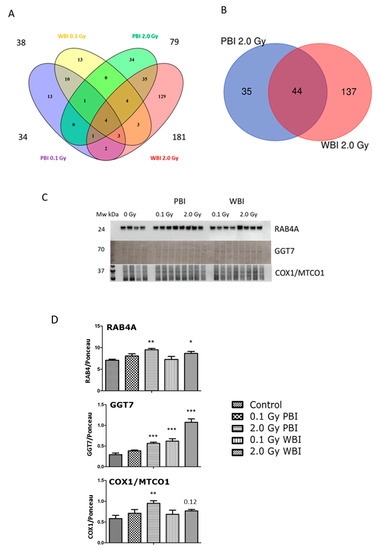 The analysis of the hippocampus proteome at 6 months post-irradiation showed fewer differentially regulated proteins than at 2 weeks except for the exposure to 2.0 Gy WBI (Table S7). The different treatment groups showed the following number of deregulated proteins: 34 (0.1 Gy PBI, Table S8), 38 (0.1 Gy WBI, Table S9), 79 (2.0 Gy PBI, Table S10) and 181 (2.0 Gy WBI, Table S11). Of these, only four proteins were differentially regulated in all groups as shown in the Venn diagram (Figure 7A). The 2.0 Gy PBI and 2.0 Gy WBI groups had 44 shared proteins that represents 55.7% and 24.3% of all deregulated proteins in these two groups, respectively (Figure 7B, Figure S3). Many of these deregulated proteins had metabolic functions showing enrichment of the molecular function “catalytic activity” (Figure S3). The 6-month proteomics data were validated using immunoblotting with antibodies against RAB4A, GGT7 and COX1/MTCO1 (Figure 7C,D, Figure S4). In comparison to the SI control, these proteins were upregulated in 2.0 Gy irradiated samples (PBI or WBI) with the exception of COX1/MTCO1 that was significantly upregulated only after 2.0 Gy PBI.
