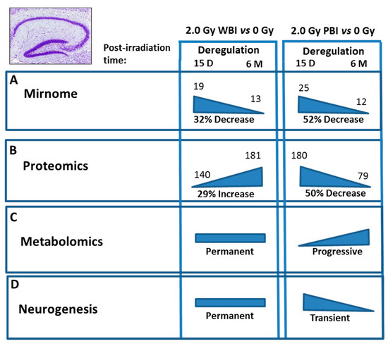 Summary of the time-dependence for multiple endpoints in the hippocampus after WBI and PBI with 2.0 Gy of X-rays. (A) Deregulated miRNAs showed a 32% decrease at 6 months (13) vs. 15 days (19) in WBI group and a 52% decrease in age-matching PBI group (12 vs. 25). (B) Proteomics showed a 29% increase in the number of deregulated proteins at 6 months (181) vs. 15 days (140) in WBI group and a 50% decrease in in age-matching PBI group (79 vs. 180). (C) Raman spectroscopy at 15 days post-irradiation showed that only the spectral fingerprints of WBI differed from that of SI hippocampi while PBI and SI could not be discriminated. At 6 months post-irradiation the WBI and PBI hippocampi could not be discriminated and both differed from SI one. (D) Neurogenesis data showed long lasting defects in WBI mice at 6 months post-irradiation, while all the defects observed at 15 days post-irradiation in PBI had disappeared at 6 months post-irradiation. Altogether, the majority of data indicated the transitory nature of the PBI effects compared to the persistence of the WBI induced-responses.