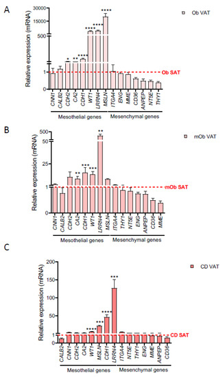 Mesothelial markers are upregulated in obese, morbid obese, and Crohn’s disease VAT with respect to SAT. qPCR analysis of mesothelial and mesenchymal marker gene expression in VAT versus SAT samples in (A) obese (ob) (ob VAT n = 10, except n = 14 for LRRN4, MSLN, KRT8, CDH1, WT1, CDH2, and CA2; ob SAT n = 10), (B) morbid obese (mob) (mob VAT n = 13 or 8, and mob SAT n = 8) and (C) Crohn’s disease (CD VAT n = 10, except n = 20 for LRRN4, MSLN, KRT8, CDH1, WT1, CDH2, and CA2; CD SAT n = 8). Mean SAT levels were normalized to 1, and are represented as a red dotted line. Abbreviations: CA2, carbonic anhydrase 2; CALB2, calretinin; CD, Crohn’s disease; ob, obese; mob, morbid obese; SAT, subcutaneous adipose tissue; VAT, visceral adipose tissue. Data are expressed as mean ± SEM; * p < 0.05; ** p < 0.01; *** p < 0.001; **** p < 0.0001 (Mann-Whitney U test).