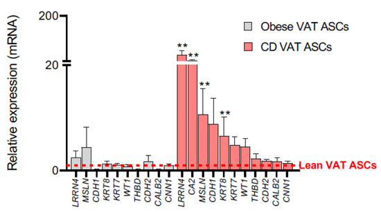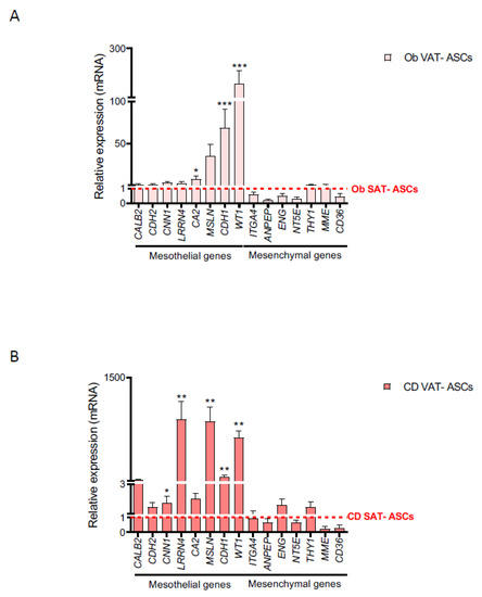 Having established a mesothelial signature for VAT from lean subjects, we extended this analysis to examine the gene expression profile of precursor cells isolated from the two distinct adipose tissue depots. As shown in Figure 1B, expression of the mesothelial genes CNN1, CDH1, MSLN, and WT1 was significantly higher in ASCs obtained from lean intra-abdominal adipose tissue than from SAT, supporting a mesothelial nature for these cells. Moreover, a reduction in the expression of mesenchymal markers was also noted for lean visceral-derived ASCs when compared with their SAT counterparts [17,35,36,37]. Overall, these results support a mesothelial origin for human VAT and its precursors.