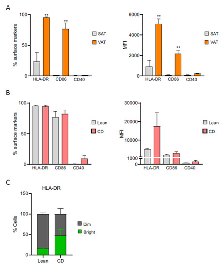 Creeping fat-derived ASCs have an altered immunophenotypic profile with respect to their lean counterparts. ASCs were stained with the panel of antibodies described and analyzed by flow cytometry using a FACSAria III (BD Biosciences, Franklin Lakes, NJ, USA) equipped with three lasers operating at 405, 488, and 633 nm. Surface markers were detected using phycoerythrin (PE) (585 nm band-pass filter), PE-Cy7 (780 nm band-pass filter), allophycocyanin (APC) (660 nm band-pass filter), Fluorescein isothiocyanate (FITC) (530 nm band-pass filter), Peridinin-Chlorophyll-Protein (PerCP-cy5.5) (695 nm band-pass filter), and BD Horizon Brilliant Violet 421 channels (450 band-pass filter). Gating was based on forward-scatter and side-scatter dot plots. A side-scatter versus Ho342 dot plot was used to discriminate nucleated cells from debris. Analysis of antigen-presenting molecules compared the (A) percentage of surface expression and mean fluorescence intensity (MFI) between subcutaneous (SAT)-derived ASCs versus visceral (VAT)-derived ASCs from lean patient and the (B) percentage of surface expression and MFI between lean-derived ASCs versus Crohn’s disease-derived ASCs, from visceral and mesenteric adipose tissue, respectively. (C) Percentage of HLA-DR subpopulations HLA-DR dim and HLA-DR bright in lean-derived and Crohn’s Disease-derived ASCs. Abbreviations: CD, Crohn’s disease; ob, obese; HLA-DR, human leucocyte antigen—DR isotype; VAT, visceral adipose tissue; SAT, subcutaneous adipose tissue. Data are expressed as the mean ± SEM; ** p < 0.01 (Mann-Whitney U test with Benjamin-Hochberg adjustment).