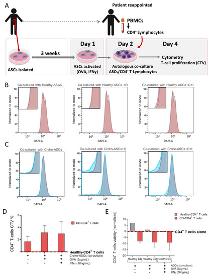 It is described that MSCs promote T-cells’ survival by exerting an anti-apoptotic effect [41]. Accordingly, we observed that healthy-derived ASCs increased T-cells’ viability (Figure 6E), an effect that was practically abolished by stimulation with OVA and IFNγ. Interestingly, Crohn’s disease ASCs induced a marked reduction on lymphocytes’ viability, which was maintained with OVA and IFNγ treatments, and is in accordance with the link between proliferation and apoptosis described for activated lymphocytes [42].