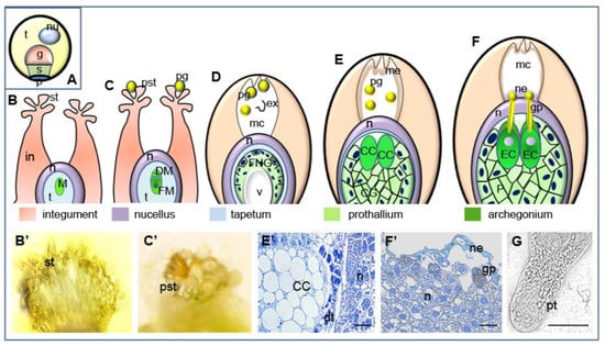 Successive stages of pollen-ovule interaction in L. decidua. (A) Mature pollen grain containing tube cell, generative cell, sterile cell and two degenerated prothallial cells; (B) unpollinated ovule (megasporocyte stage), (B’) unpollinated stigmatic tip, (C) pollinated ovule (stage of megaspores), (C’) stigmatic tip with pollen grains, (D) free nuclear gametophyte stage—pollen grains are engulfed into the micropylar canal and shed their exine, (E) cellular gametophyte stage—pollen grains are carried to the nucellar apex through the micropylar canal filled with secretions, (E’) at the cellular gametophyte central cell is visible, (F) mature ovule—pollen grains germinate on the surface of the nucellus when the prothallium contains mature archegonia and grow into the egg cell, (F’) the germinating pollen grain on the surface of the nucellus filled with secretions, (G) in vitro germinating pollen grain. g generative cell, t tube cell, s sterile cell, p prothallial cells, nu nucleus, SC sterile cell, nu nucleus, in integument, st stigmatic tip, pst pollinated stigmatic tip, n nucellus, pg pollen grain t tapetum, M megasporocyte, DM degenerating megaspores, FM functional megaspore, FNG free nuclear gametophyte, ex exine, mc micropylar canal, v vacuole, CC central cell, CG cellular gametophyte, me micropylar canal exudate, EC egg cell, P prothallium, gp germinating pollen grain, ne nucellus exudate, dt degenerating tapetum, pt pollen tube. Bars 10 µm.